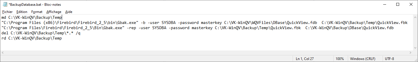 Dans le script "BackupDatabase.bat", vérifier le chemin d'accès à l'outil de compression Firebird "Gbak.exe".