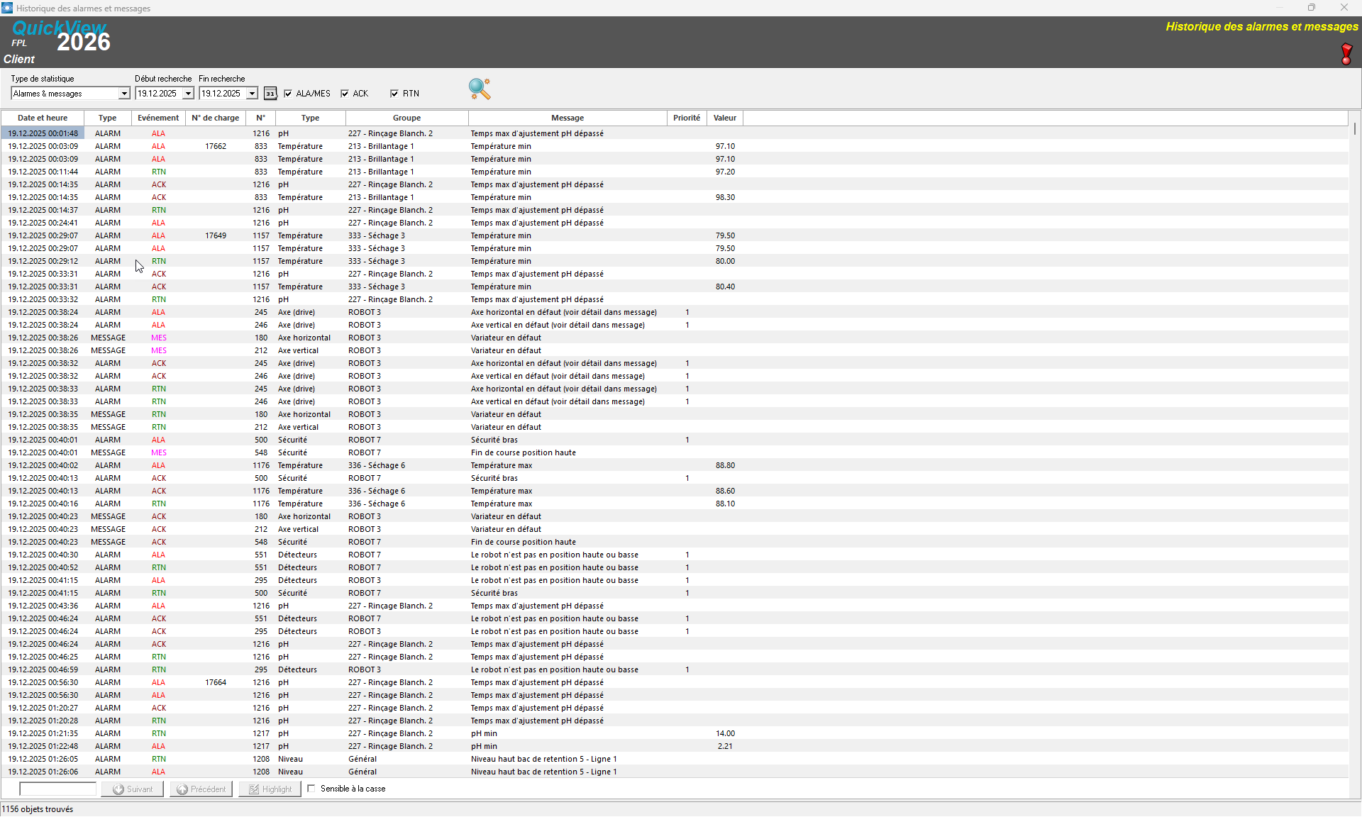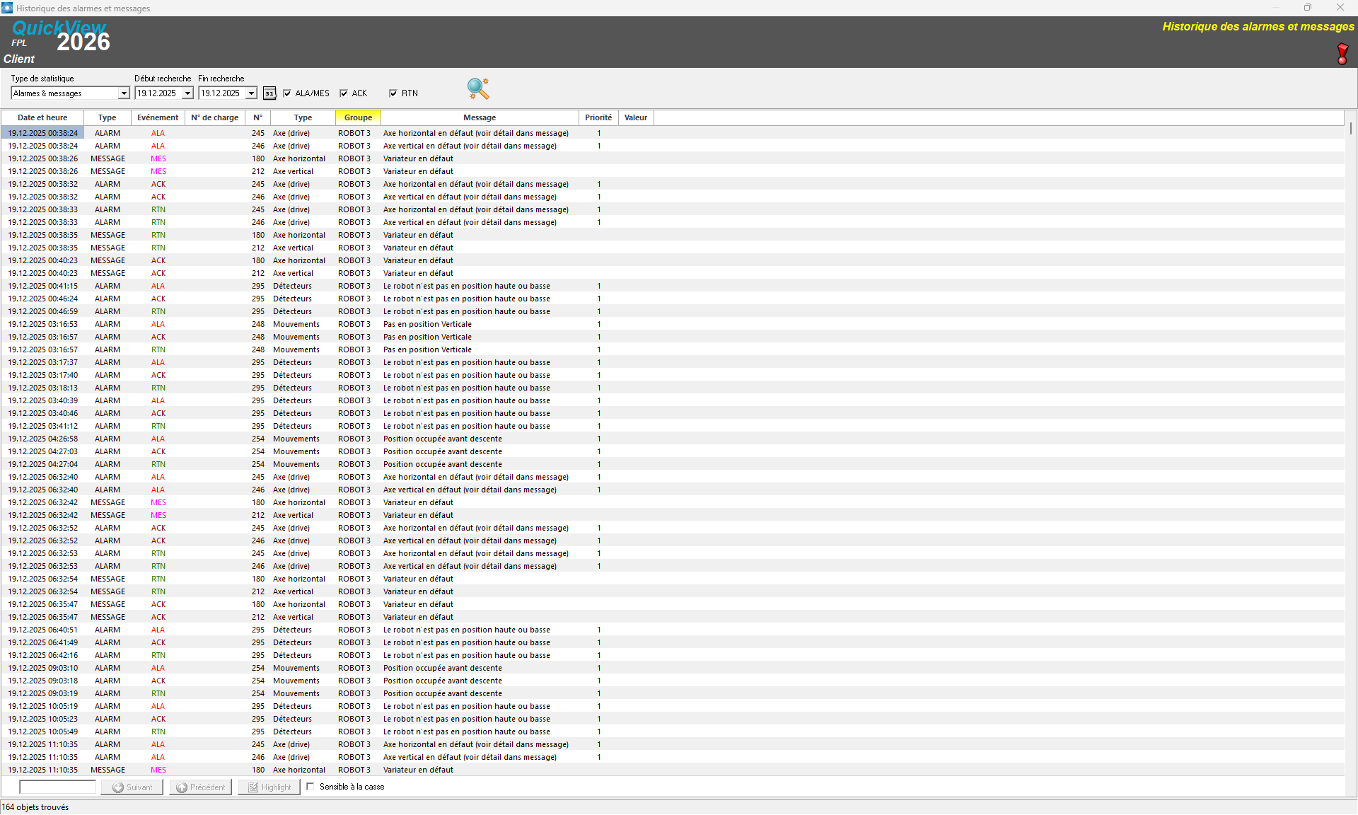 Il est possible d'afficher toutes les alarmes d'un même type ou d'un même groupe ou d'un même message en double-cliquant sur la colonne désirée.
