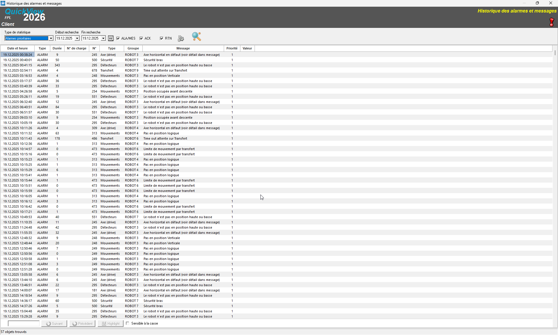 Cette liste tient compte des arrêts d'urgence. Lorsqu'une alarme d'arrêt d'urgence est activée, toutes les alarmes situés entre le début de l'arrêt d'urgence et la fin de celle-ci sont éliminées. De plus, lorsqu'une alarme sur un robot intervient, toutes les autres alarmes du même robot sont inhibées pendant la durée de la première alarme car certaines fois des alarmes sont générées à cause de la première alarme et elles sont pas significatives pour le calcul du MTBF.