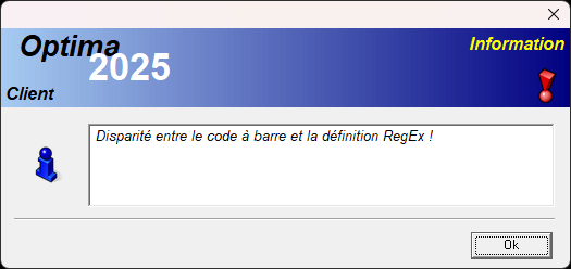 - Scan de la Référence (Dbase référence). N'importe quel barcode est autorisé. Le système contrôle que ce code existe dans la base de donnée Optima.