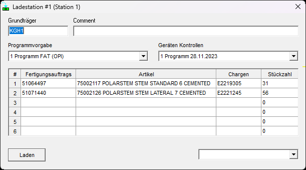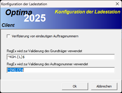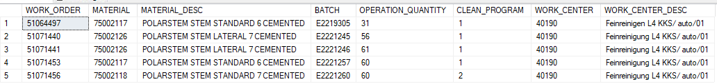 - Scan du Fertigungsauftrags (OF). Règle définie selon RegEx. Une requête est transmise à une base de données externe (côté client) avec ce numéro d'OF (WORK_ORDER). Les autres champs de la ligne correspondante sont alors automatiquement ajouté dans le poste de charge. Le programme de lavage ainsi que le mode d'équipement sont aussi automatiquement renseigné. Le mode d'équipement doit avoir le même numéro que le programme (CLEAN_PROGRAM).