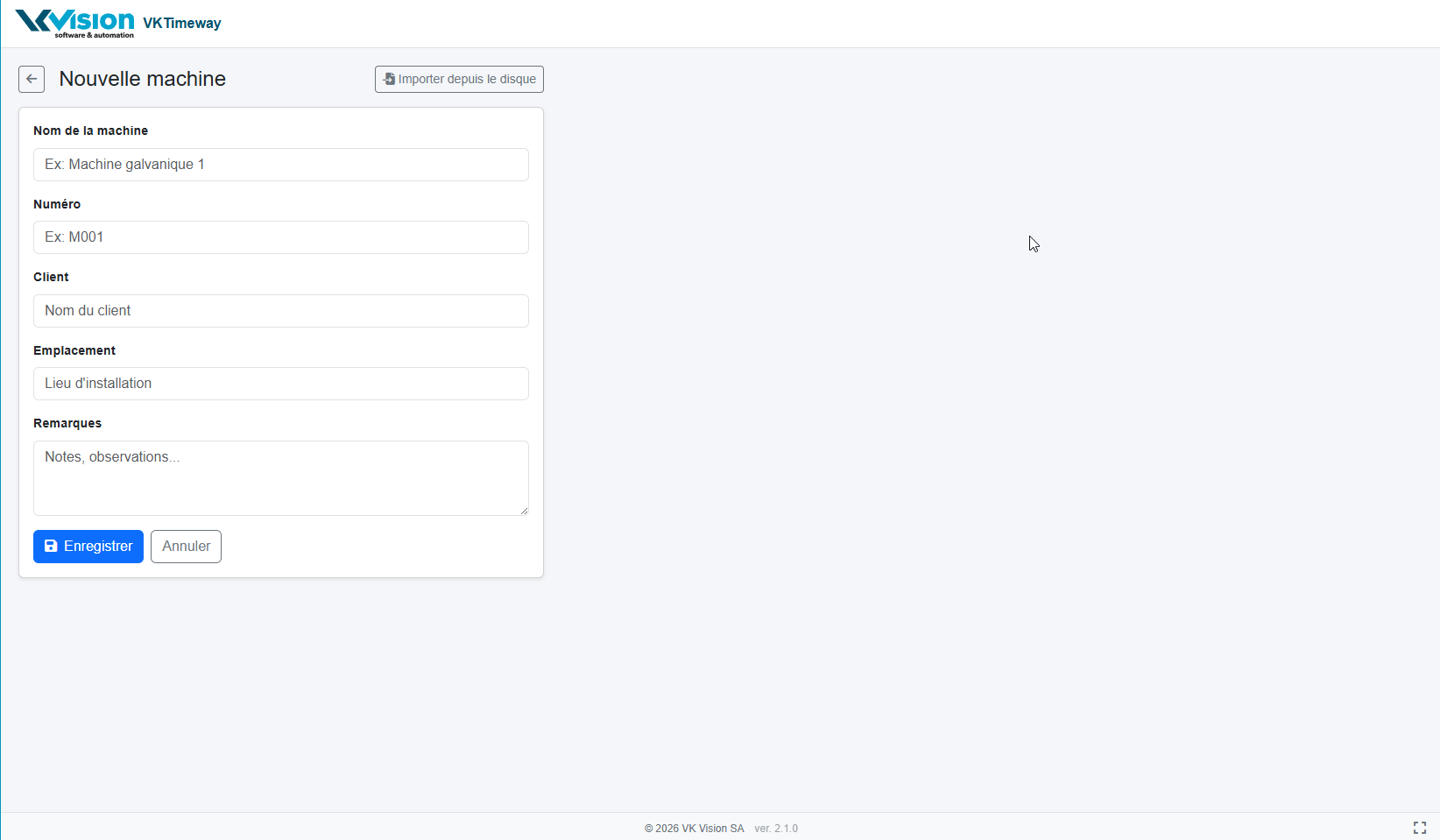Vous pouvez définir tous les champs et cliquer sur [enregistrer]. La nouvelle machine sera créée. En cliquant sur [Importer depuis le disque], vous pouvez importer une configuration d'une machine de VKQuickView ou d'un diagramme exporté par l'ancienne version de VKTimeway.