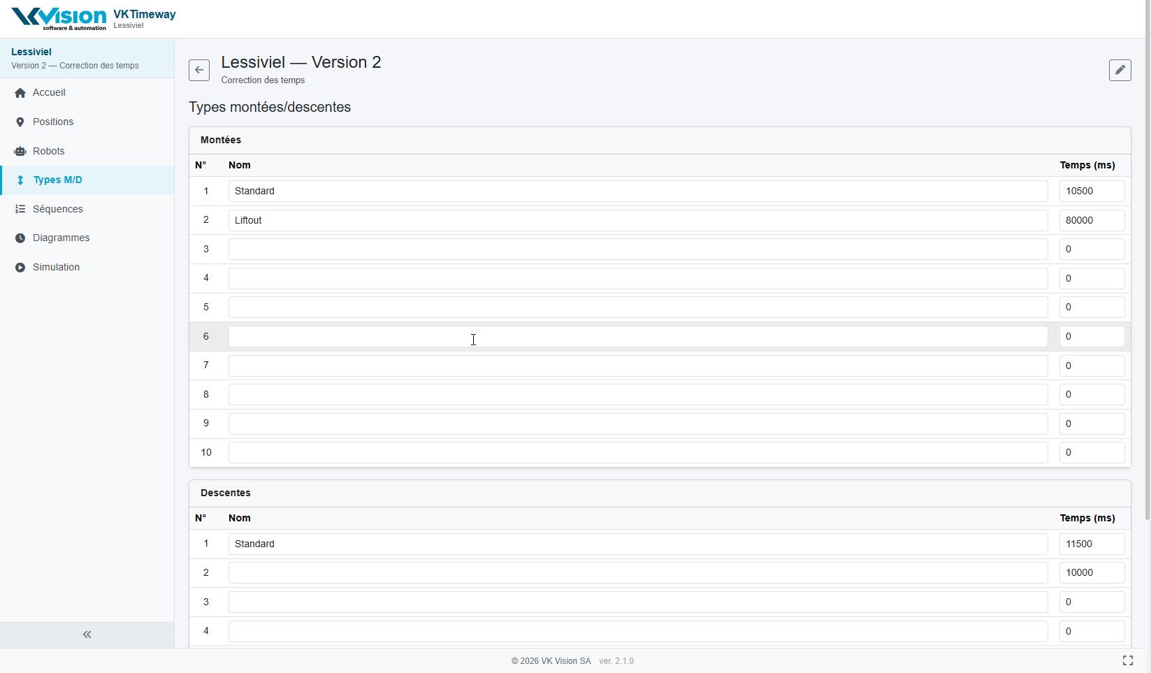 | Type M/D | Edition des types de montées/descentes effectués par les robots |