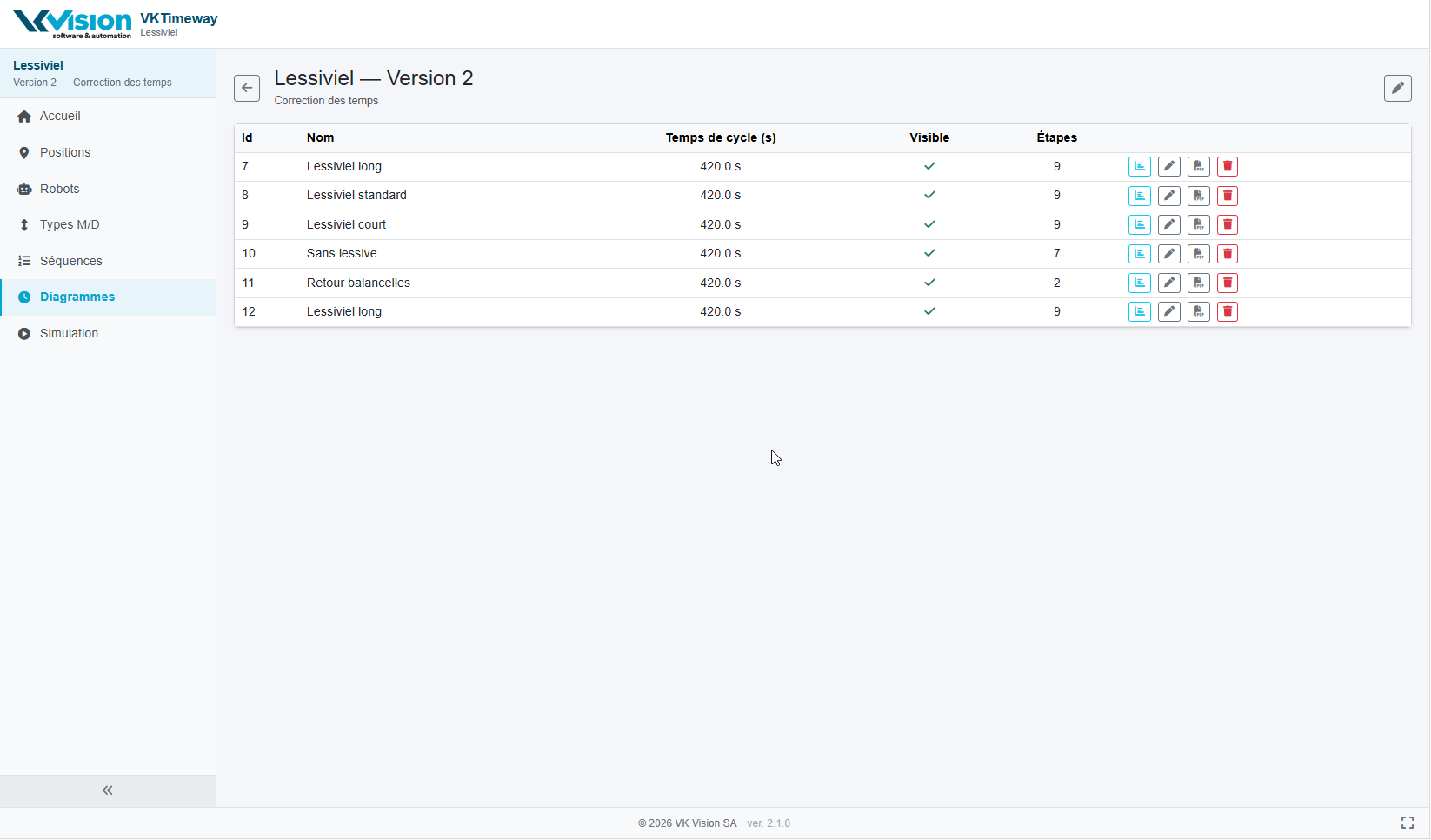 Pour chaque diagramme, vous pouvez lancer l'éditeur de diagrammes, éditer le diagramme, exporter la liste des étapes dans un document pdf ou effacer ce diagramme.